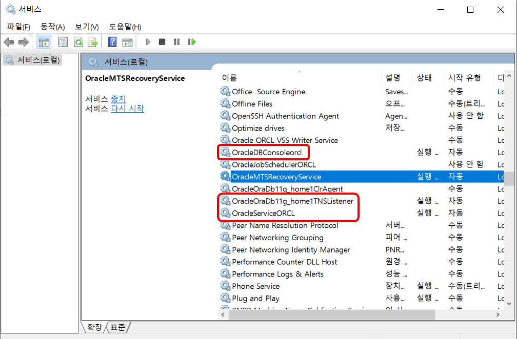 오라클과 관련된 로컬서비스 수동관리