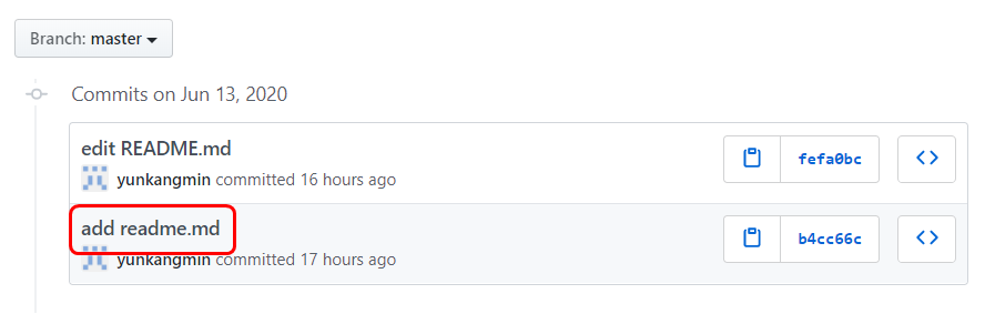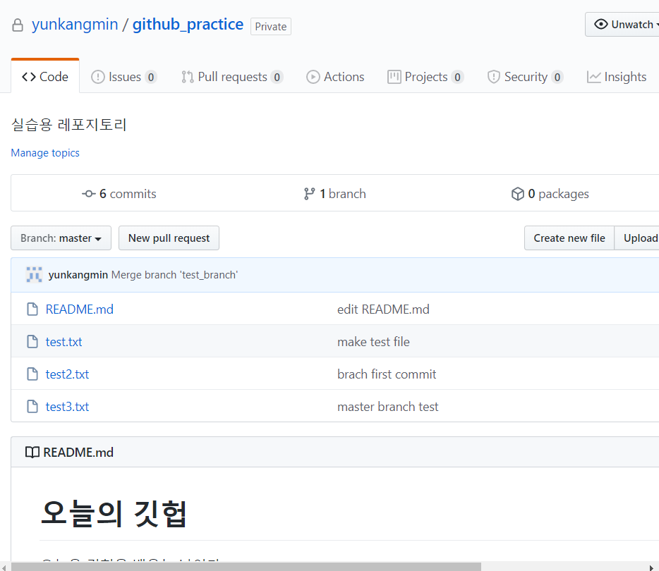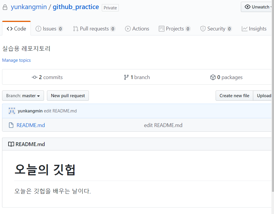 https://github.com/yunkangmin/github_practice에서 새로고침을 하면 아래와 같이 나온다.