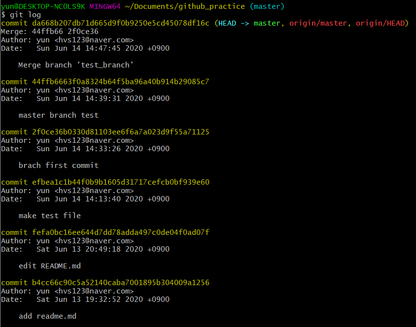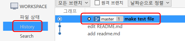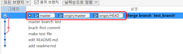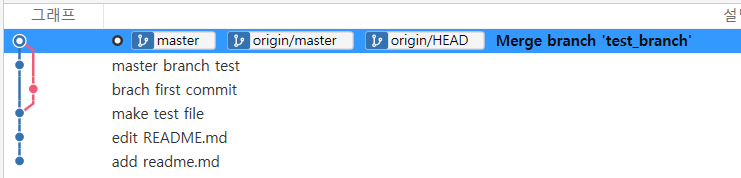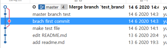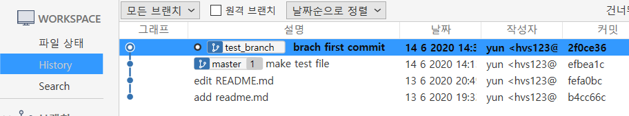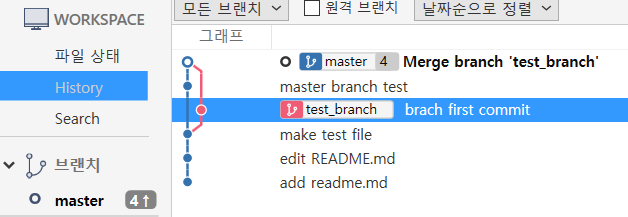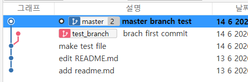 master와 test_branch가 각각 진행되고 있는 걸 확인할 수 있다.