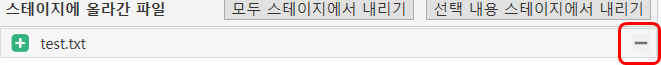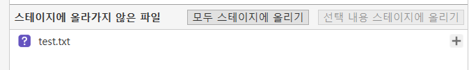 아래와 같이 파일상태를 누르고 스테이지에 올라가지 않은 파일에서 "test.txt" 파일을 선택한 뒤 '선택 내용 스테이지에 올리기' 버튼을 클릭하면 "스테이지에 올라간 파일"에 "test.txt" 파일이 뜨는 걸 확인할 수 있다.