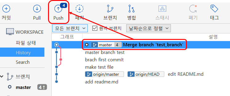 확인을 누르면 다시 합쳐졌다고 뜨고 master가 맨위에 뜬다. 머지도 하나의 버전 변경이기 때문에 기록이 남는다. 자동으로 커밋 메시지도 작성이 되있다. test_branch는 이미 기능을 다했다. 기능을 다 썻는 데도 그래프에 남겨두면 나중에 버전관리 시에 힘들 수도 있다.