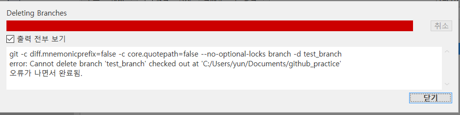 ※ 아래와 같이 안된다고 창이 뜨는 것은 test_branch에 체크아웃이 되있는데 test_branch를 삭제하려고 해서 그런 것이다. master 브랜치에 체크아웃을 하고 test_branch를 삭제해야 한다.