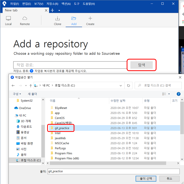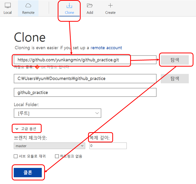 github에서 내 레포지토리인 'git_practice' 레포지토리의 url을 복사한다. 아래 첫번째 입력칸에 붙여넣고 탐색을 누르면 아래 입력항목들이 자동으로 채워진다. 2번째 입력항목에는 로컬에 원격 레포지토리를 클론할 때 로컬에 저장할 위치이다. 그 다음 클론 버튼을 누른다.