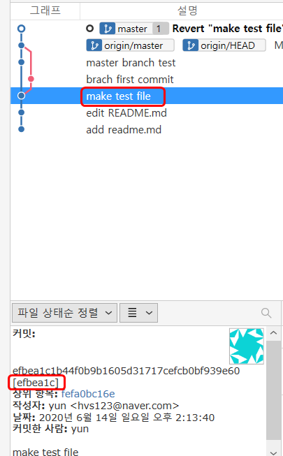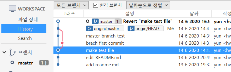 최상단에 "Revert 'make test file'"이라는 커밋이 하나 추가된 것을 확인할 수 있다.