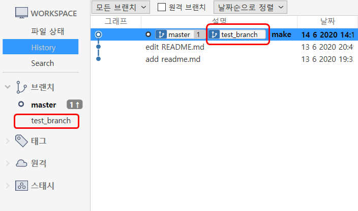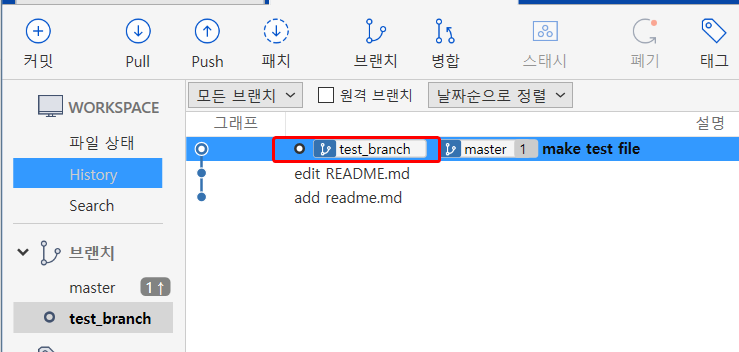 소스트리에서 다시 test_branch로 체크아웃하면 아래와 같이 뜨는 것을 확인할 수 있다.