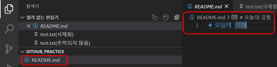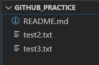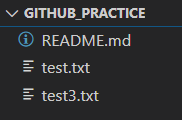 github_practice 폴더에는 test.txt는 보이지 않고 처음에 만들었던 README.md 파일이 처음으로 돌아와있다.