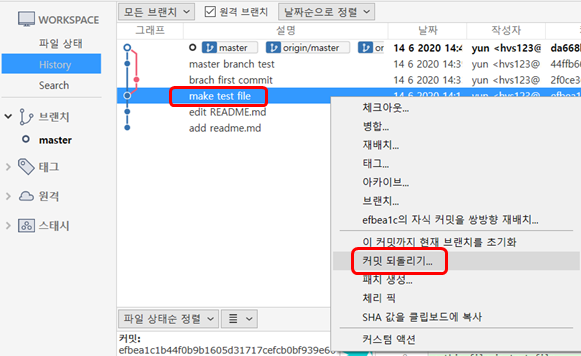 소스트리에서 아래와 같이 커밋 되돌리기를 눌러보자. 'make test file'에서는 'test.txt'파일을 생성하고 커밋했었다.