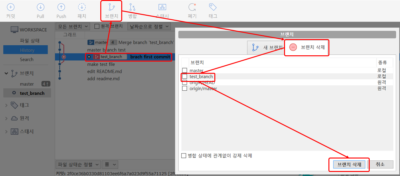 master 브랜치에 체크아웃이 되있는 지 확인한 뒤 아래와 같이 클릭하여 test_branch를 삭제한다.