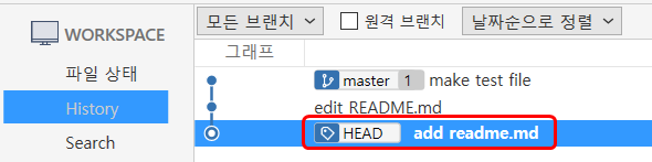 아래 커밋 항목을 더블클릭하면 체크아웃이 된다.