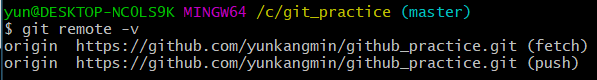 git remote add origin https://github.com/yunkangmin/github_practice.git <- 로컬 git에 url 원격 저장소를 origin이라는 이름으로 추가해서 연결한다. 원격 저장소 이름이 'orgin'이 된다. 위와 같이 긴 url을 안쳐도 된다. alias라고 보면 된다.