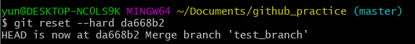 현재 test_branch가 master보다 한 칸 앞에 있다. 사실 그림은 일직선이지만 2갈래로 나눠진 것이다.