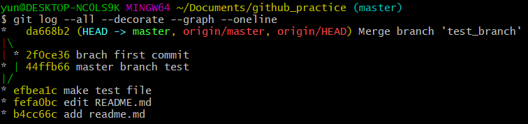 git log --all --decorate --graph --oneline <- git log를 모든 브랜치를 꾸며진 상태로 그래프모드로 볼 것이고 커밋 설명을 한줄로 보겠다는 의미이다.