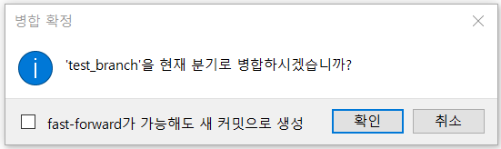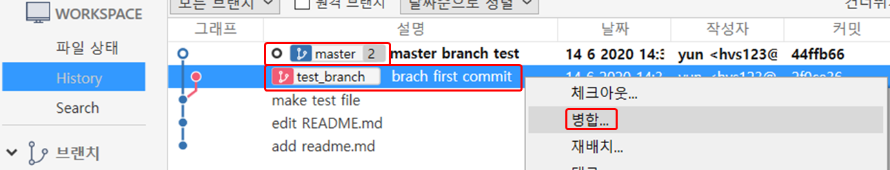 master 브랜치로 체크아웃 한 뒤 바로 아래 test_branch 우클릭한 뒤 병합을 클릭한다.