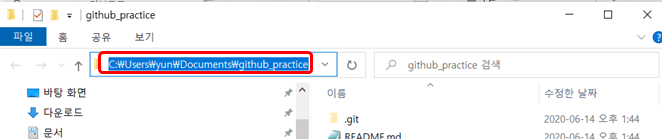 git bash에서 git_practice 폴더가 있는 곳에서 아래 명령어를 차례로 입력한다.