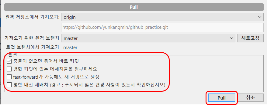아래와 같이 선택하고 Pull 버튼을 클릭한다.