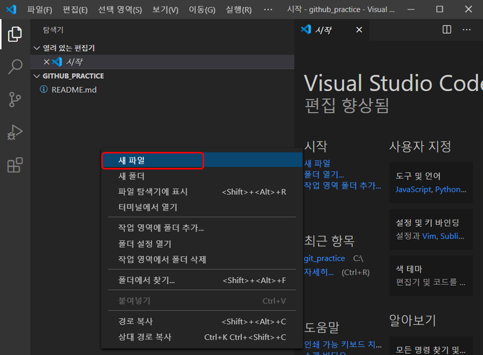 echo "# github_practice" >> README.md -> README.md 파일을 만든다.