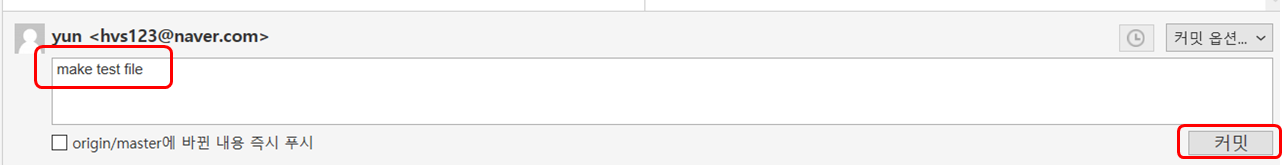 소스트리 하단에 아래와 같이 "make test file"이라고 입력후 커밋 버튼을 누른다.
