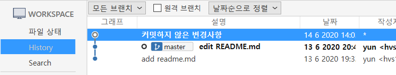 소스트리를 가보면 아래와 같이 커밋하지 않은 변경사항이라고 뜬다.