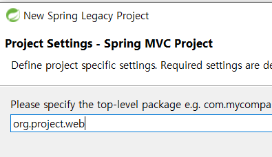 아래와 같이 패키지명을 입력 후 Finish 버튼을 클릭하면 메이븐이 필요한 라이브러리들을 다운로드 받기 시작한다. 메이븐은 빌드도구로서 필요한 라이브러리들을 다운로드하며 빌드에 필요한 작업들을 수행한다.