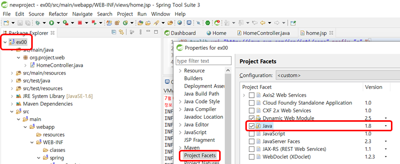 프로젝트를 우클릭하여 properties를 클릭한뒤 아래와 같이 JDK 버전을 1.8로 변경한다.