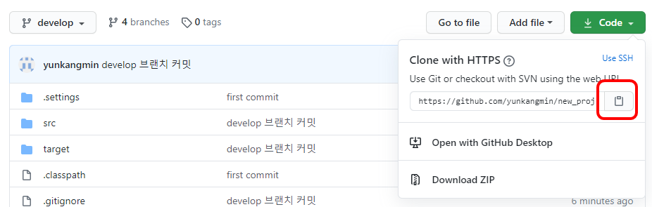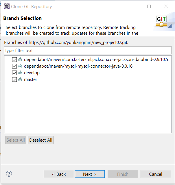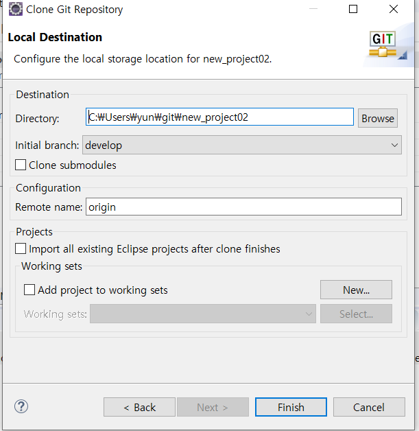 finish 클릭(develop 브랜치가 선택되어야 한다.).