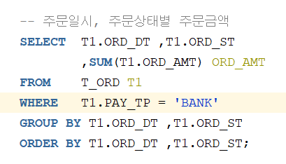 결과를 보면 주문일시와 주문상태별로 주문금액이 출력된다. group by 뒤에 그룹화하고 싶은 컬럼을 입력하면 같은 데이터끼리 그룹화되어 표시된다. 컬럼이 2개이상이라면 첫번째 컬럼이 대분류, 두번째 컬럼이 중분류 이런 식으로 그룹화된다. select 절을 보면 group by에 명시한 컬럼이 있다. group by에 명시한 컬럼은 select 절에서 그대로 사용할 수 있고 group by에 명시되지 않은 컬럼은 select 구문에서 집계함수(SUM, AVG, MIN, MAX등등)로만 조회할 수 있다.