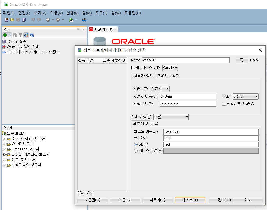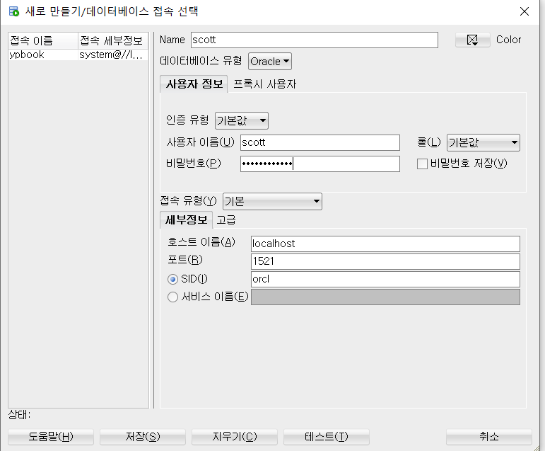 비밀번호 : 오라클 데이터베이스 설치 시 설정한 비밀번호