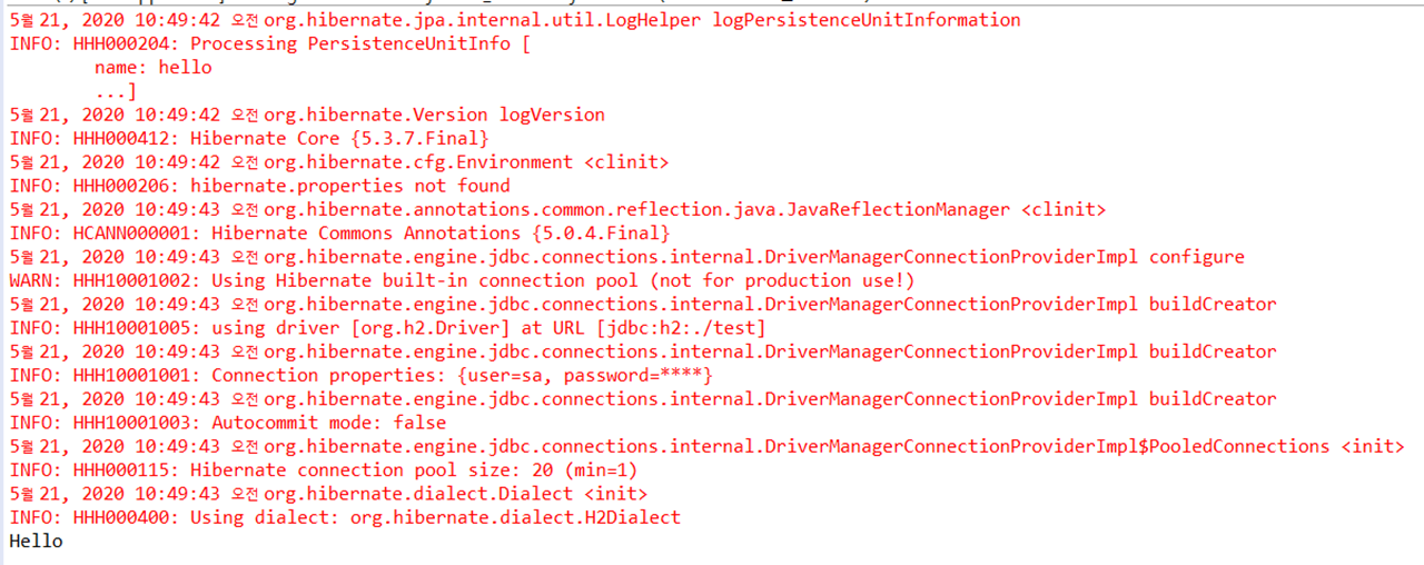 Main 클래스에서 라인 9, 10과 같이 코드를 추가하자. 라인 10에 Persistenct.createEntityManagerFactory("hello") 코드에서 createEntityManagerFactory() 메서드에 매개변수로 "hello"를 넘기고 있다. 이는 아래 persistence.xml 파일에서 라인 3 <persistence-unit name="hello"> 태그의 name 속성값인 "hello"를 나타낸다. 즉, 메인 클래스에서 "hello"라는 이름으로 persistence.xml 파일에 있는 설정정보를 가져와서 로딩을 하겠다는 의미이다.