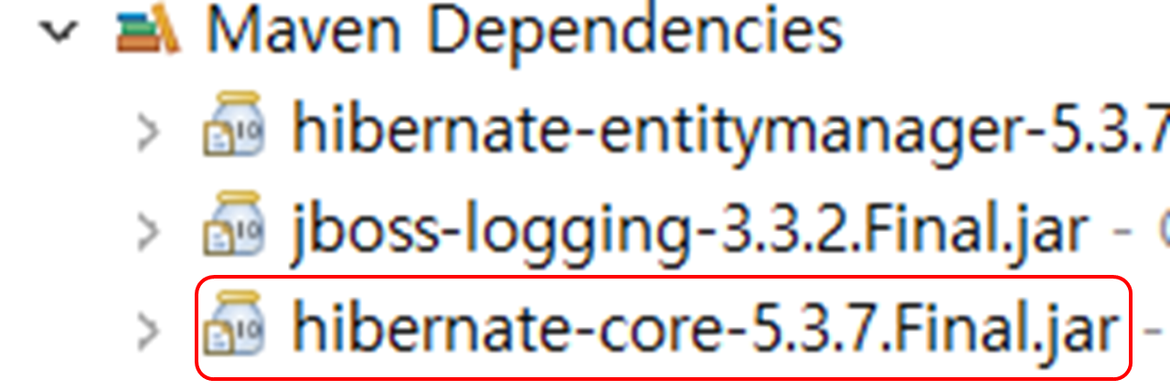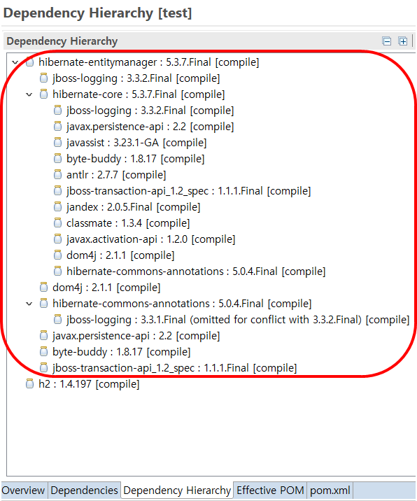 pom.xml에 Dependency Hierachy 탭을 보자. "hibernate-entitymanager" 라이브러리가 아래에서 보는 것과 같이 무수히 많은 라이브러리를 같이 다운받은 것을 확인할 수 있다. 간단히 보자면 "hibernate-core"와 "javax.persistence-api"(JPA 인터페이스)를 다운받은 것을 알 수 있다.