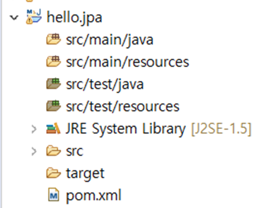 완료되면 hello.jpa라는 프로젝트가 만들어진다. 표준 메이븐 아키텍처 구조가 생성이 된 것이다.