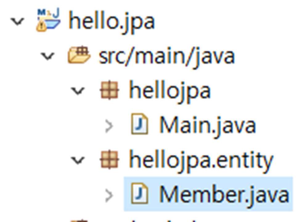 Main 클래스 안에 Main 메서드를 만든 후 잘 실행되는지 실행해보자. 그리고 "hellojpa" 패키지에 "entity"라는 패키지를 만들고 그 안에 Member 클래스를 만들자.