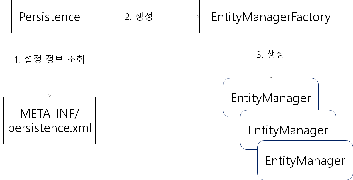 JPA는 Persistence 클래스를 통해서 persistence.xml 설정정보를 읽은 후 EntityManagerFactory를 만든다. EntityManagerFactory는 EntityManager를 만든다. 트랜잭션 단위로 업무를 처리할 때 EntityManager를 새로 만들어야 한다.