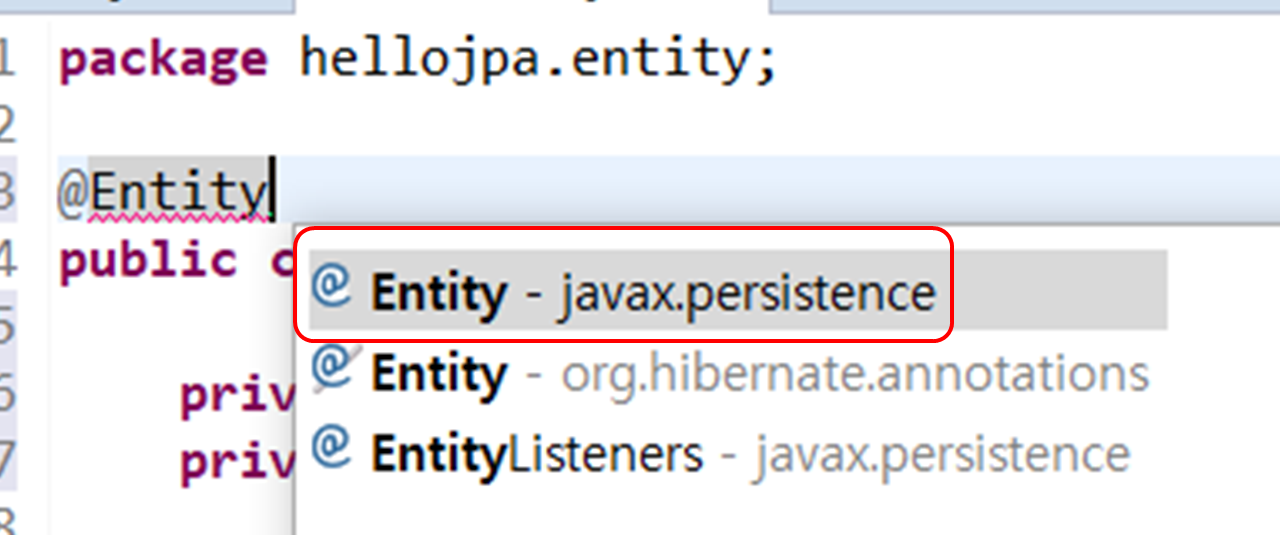 라인 6 @Entity 어노테이션은 아래와 같이 javax.persistence 패키지를 선택해야 한다. 라인 9 @Id 어노테이션도 마찬가지로 같은 패키지를 선택해야한다.(라인 3, 4참고). 마지막으로 라인 1 패키지경로가 같은지 확인하자.