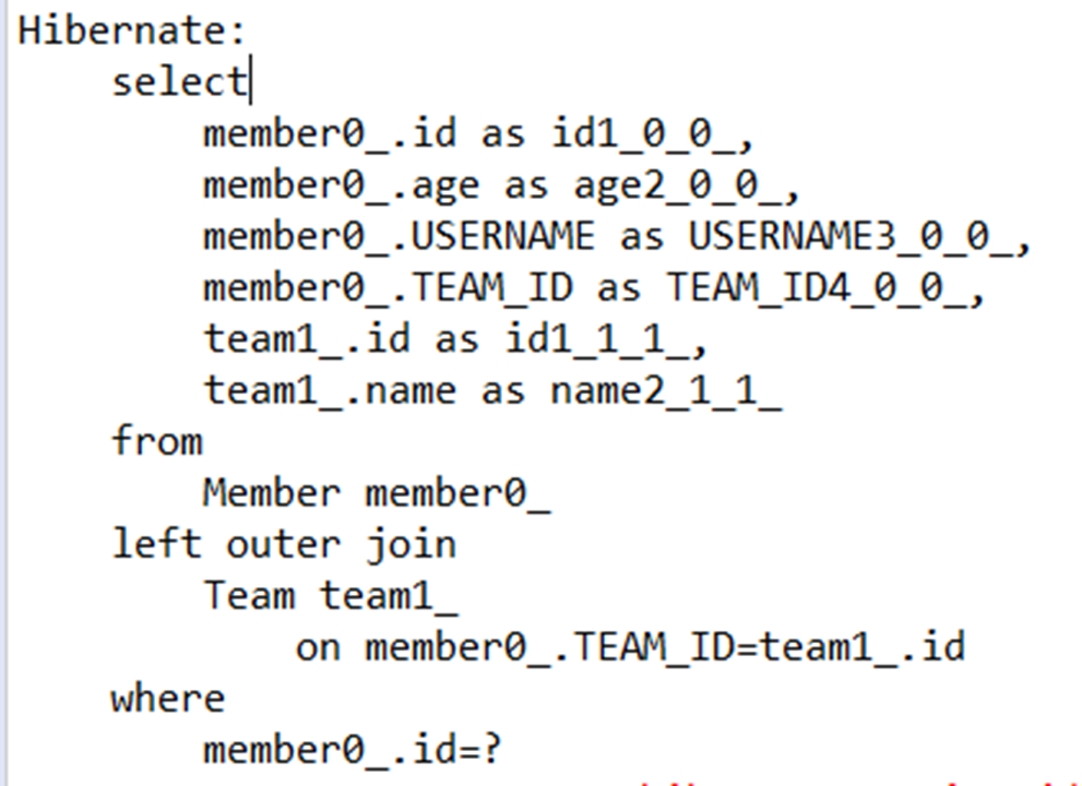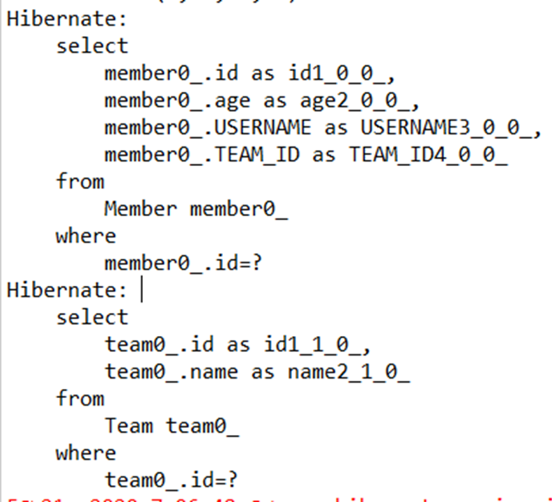 Team 객체는 실제 team 객체에서 정보를 실제 사용하는 시점에 쿼리를 날린다. 아래 코드와 같이 라인 4 findTeam.getName() 코드를 Main 클래스에 추가하고 실행해보자.