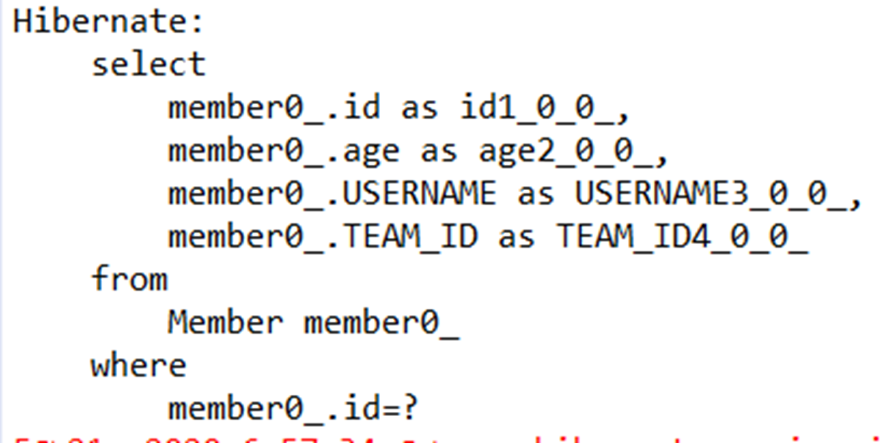 사실 Main 클래스 라인 2에서 team을 조회해도 SELECT 쿼리가 안나간다.(이클립스 콘솔창에서 쿼리를 확인할 수가 없다.) 이유는 내부적으로 캐싱을 해서 그렇다.