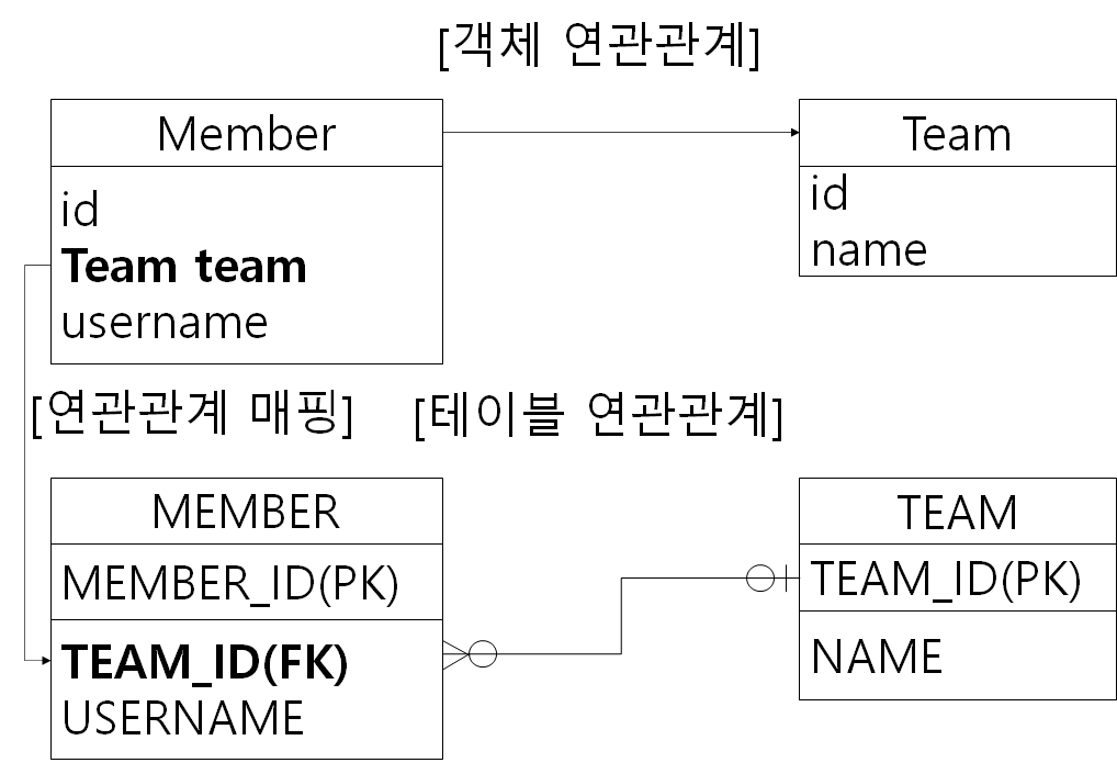 정리하자면 먼저 위와 같이 연관관계 설정을 하기 위해서는 객체 간의 연관관계가 있어야 한다.(Member 클래스에 Team 객체를 필드로 참조하는 것) 반면 테이블은 변경된 것이 없다. 그리고 연관관계를 맺는 객체의 참조와 데이터베이스의 외래키를 매핑해주는 것이다. 이게 바로 연관관계 매핑이다.