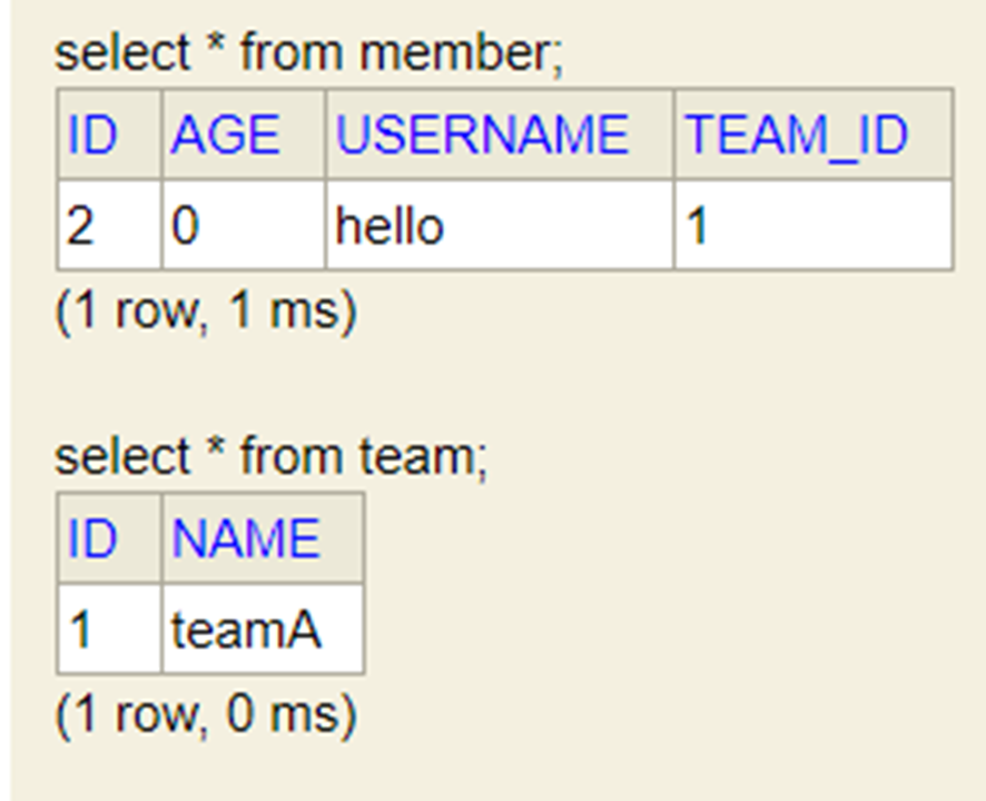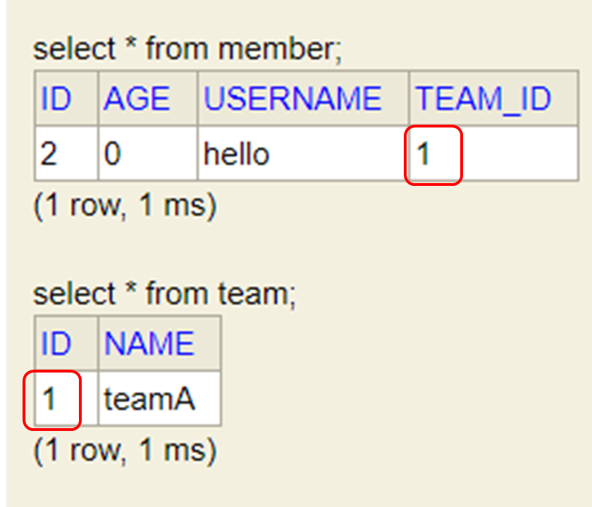 위와 같이 Member 클래스와 Team 클래스, Main 클래스를 작성하자. 그리고 실행하자. H2 콘솔을 통해 확인하니 MEMBER 테이블의 TEAM_ID 컬럼에 1, TEAM 테이블의 ID컬럼에 1이 들어간 것을 확인할 수 있다.