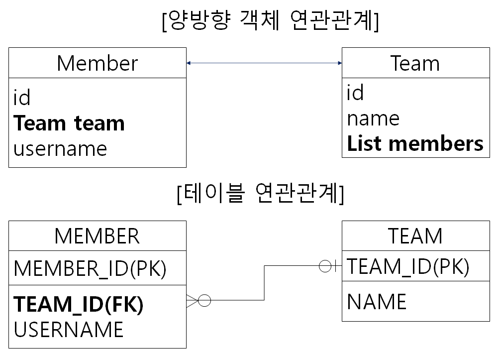 간단하게 말하자면 Member에서도 Team 가고 싶고 Team에서도 Member를 가는 것이다. Team에서 Member를 가져오고 싶으면 1 대 다 매핑이기 때문에 List 타입으로 선언해서 가져오면 된다. 그런데 DB는 변경되는 게 없다. 왜냐하면 DB는 다 가져올 수 있으니 말이다. DB는 방향이 없다. 그런데 객체는 member.getTeam()도 있고 team.getMembers() 2개 다 있다. 이게 바로 DB와 객체의 가장 큰 차이다.