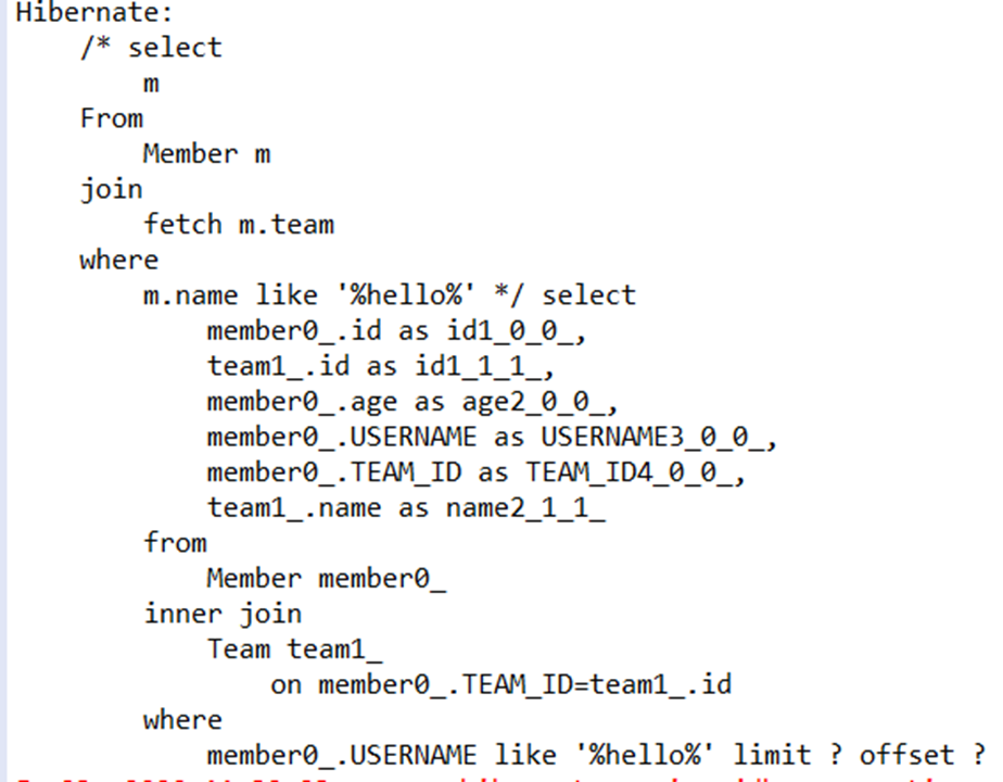 이번에는 위 Main 클래스 코드에서 라인 13 쿼리를 "select m From Member m join fetch m.team where m.name like '%hello%'"로 변경하고 테스트 해보자. fetch join으로 Member와 team의 필드를 한 번에 조회하여 가져오는 것이다.